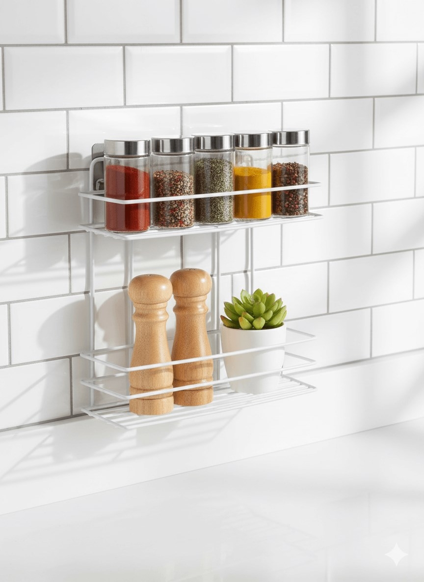 Paslanmaz metal gövde ve termo plastik kaplama sayesinde yağ/buhar ve neme karşı yüksek direnç sunan 2 katlı duvar tipi mutfak askısı & baharatlık rafıdır. Baharat kavanozları, yağlık-sirkelik, sos şişeleri, çay-kahve malzemeleri ve küçük kavanozları tezgâh üstünden duvara taşıyarak düzen ve alan kazandırır. Duvara monte tasarım; hem Yapıştır (pratik) hem de Vidala (kalıcı) seçenekleriyle esneklik sağlar.