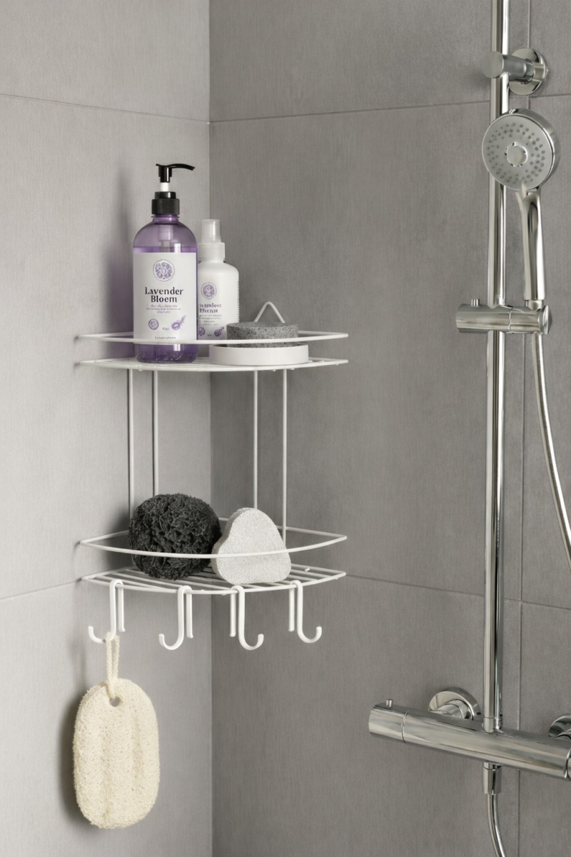 Beyaz 2 Katlı Yapışkanlı Banyo Köşe Rafı - Hareketli Kancalı Düzenleyici