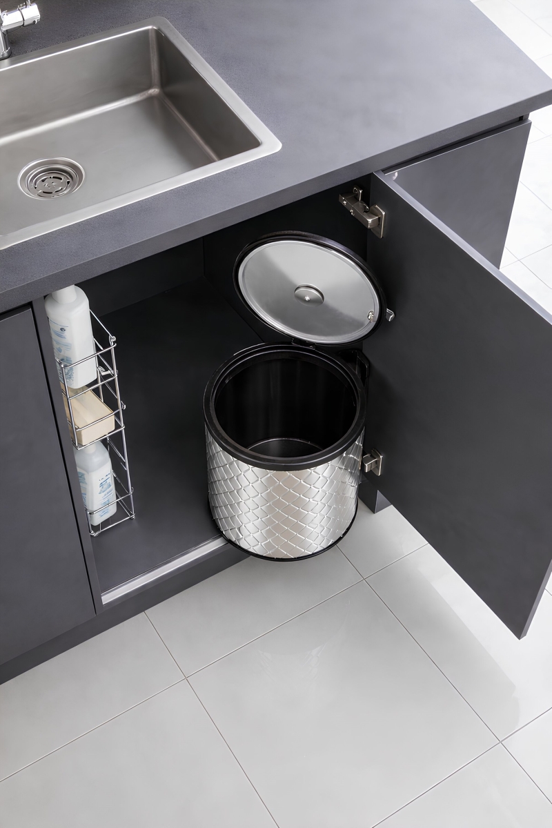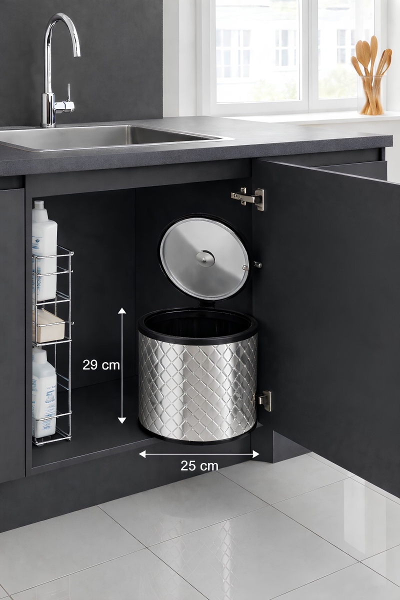 Paslanmaz metal yapısı sayesinde uzun süre kullanabileceğiniz bu çöp kovası, evye altı ve dolap içlerinde yer kaplamadan pratik kullanım sunar. Kolay montajı ve çıkarılabilir iç haznesiyle temizlik zahmetini minimuma indirir.