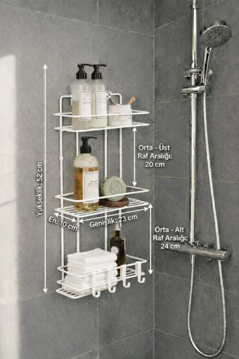 Paslanmaya karşı dayanıklı metal gövdesiyle uzun ömürlü kullanım sunan bu banyo rafı; ister yapışkanlı olarak duvarınızı delmeden, ister hazır vidalama delikleriyle ekstra sağlamlıkla monte edilebilir. Kancalı tasarımı ile lif, havlu ve aksesuarlarınızı asmak için de ideal bir çözüm sunar.