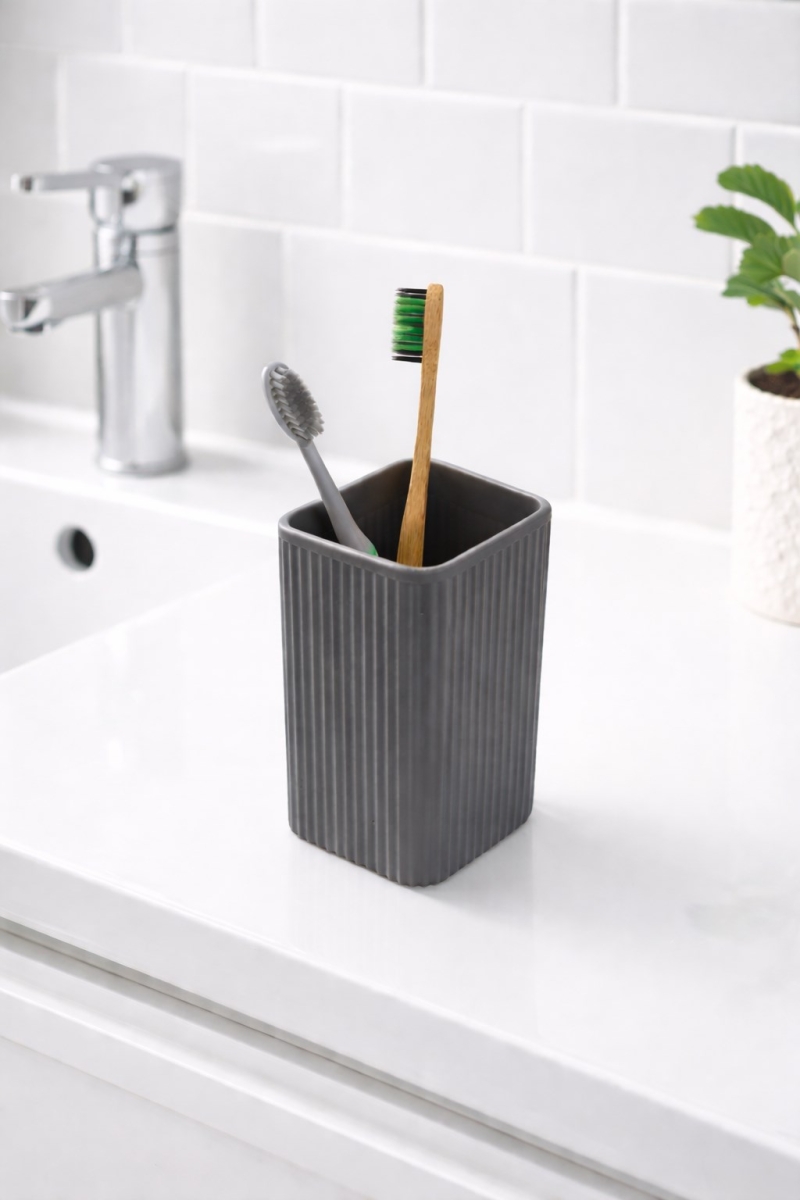 Lines Serisi Gri Banyo Seti, 3 Parça Oval Akrilik Sabunluk Fırçalık ve Sıvı Sabunluk Takımı - 3319