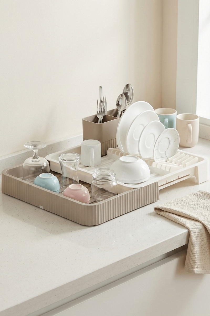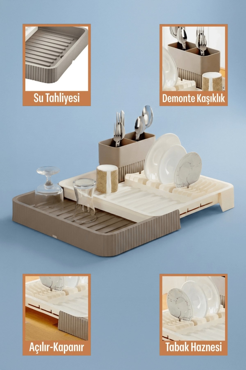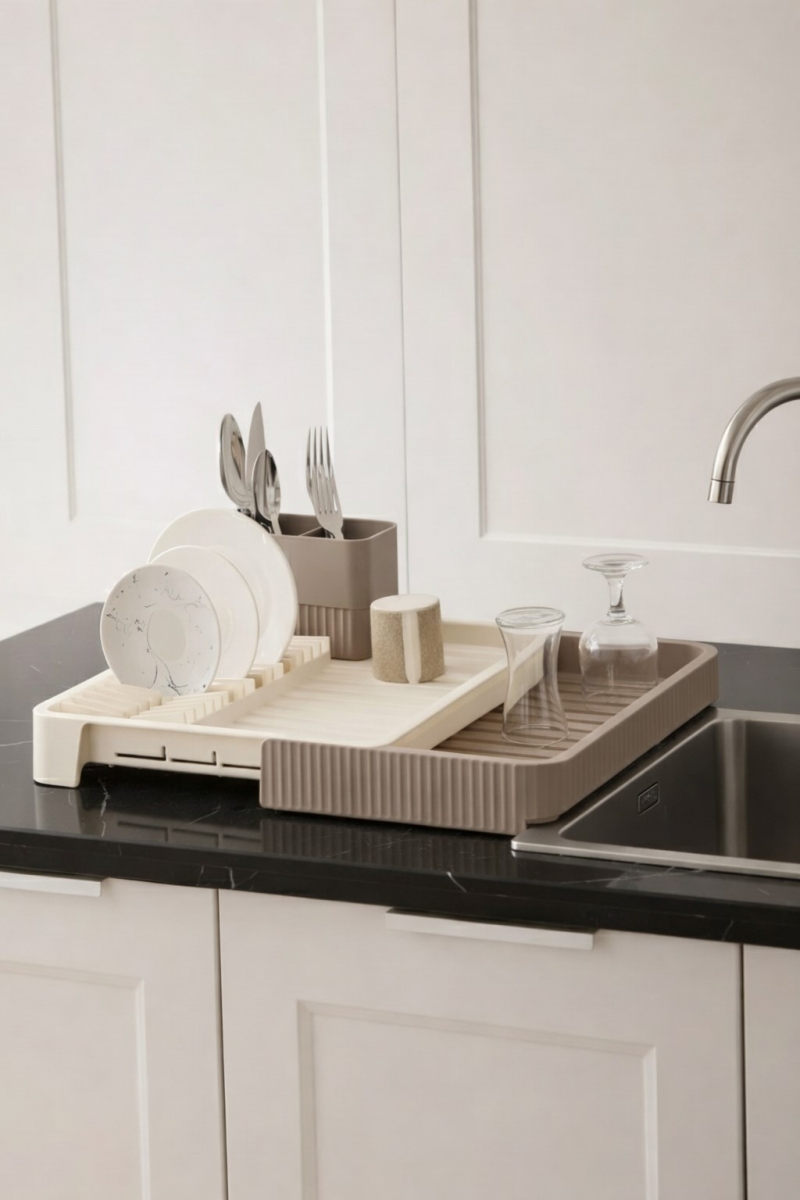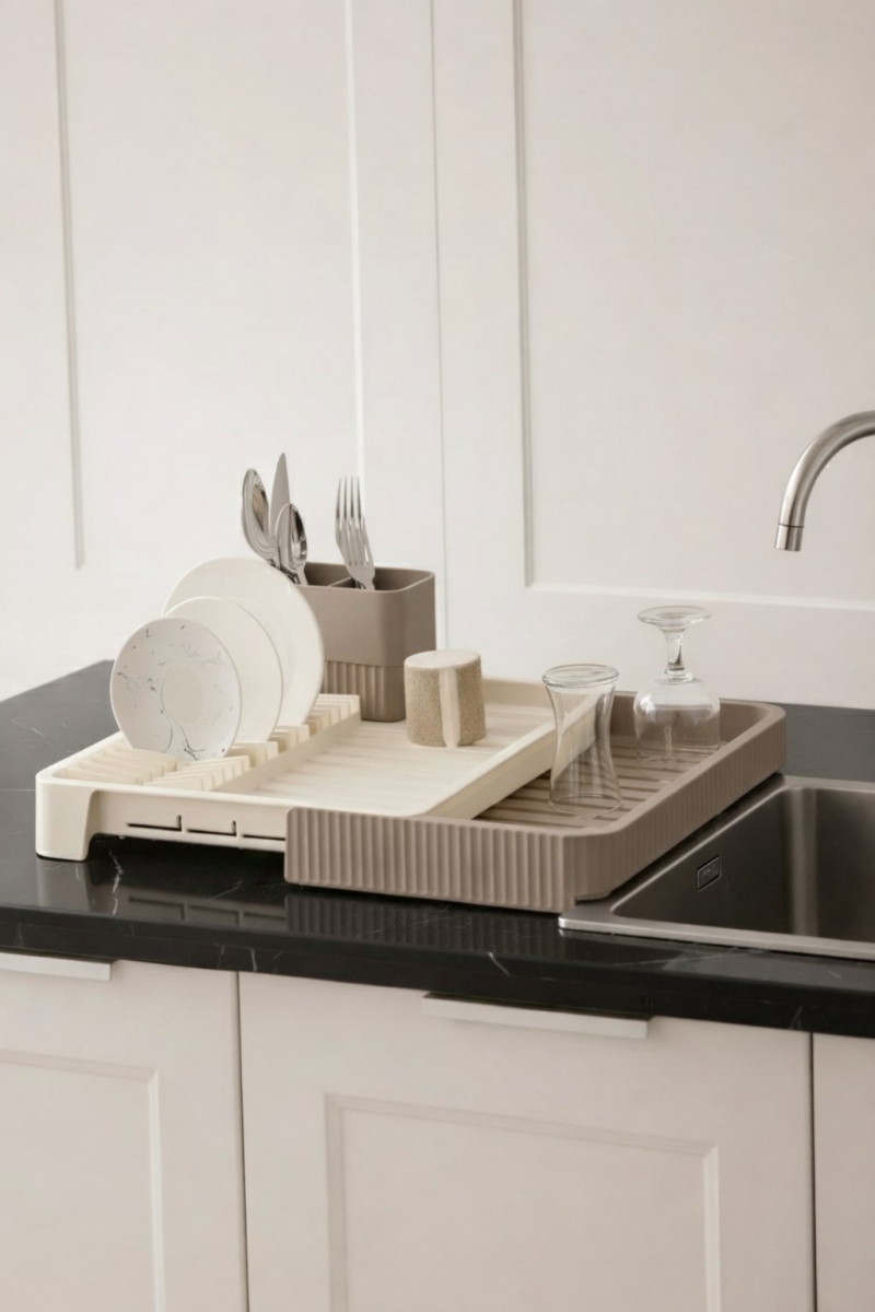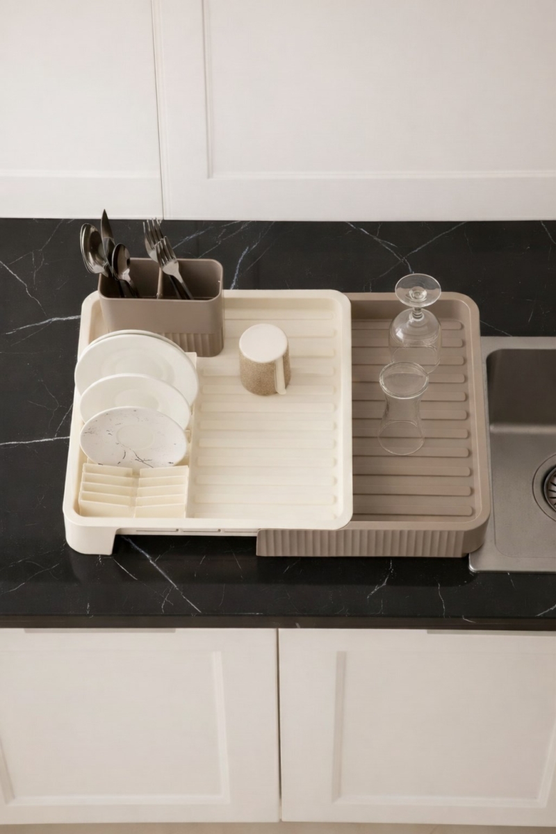 Krem Uzayabilir Sürgülü Bulaşık Sepeti, Lavabo/Tezgah Üstü Açılır Kapanır Bulaşıklık Kurutma Sepeti