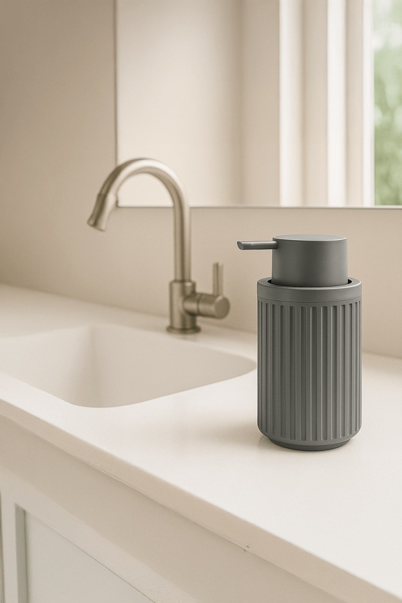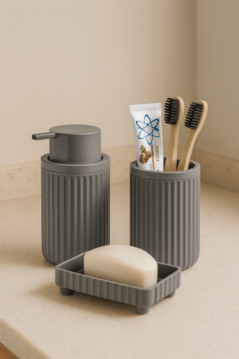 Yumuşak gri tonları ve sade tasarımıyla banyonuza ferah bir görünüm kazandıran Lines Serisi 3 Parça Banyo Seti, akrilik plastikten üretilmiştir. Şıklığı ve işlevselliği bir araya getiren bu set; diş fırçalık, sıvı sabunluk ve katı sabunluk ile günlük kullanımınızı hem düzenli hem estetik hale getirir.