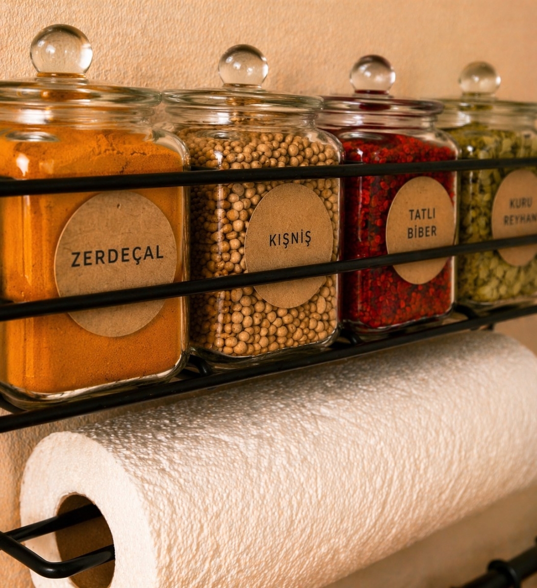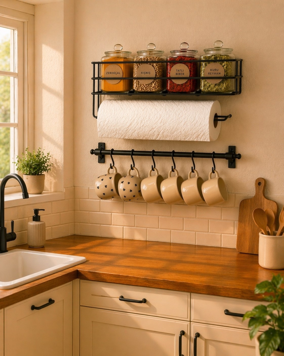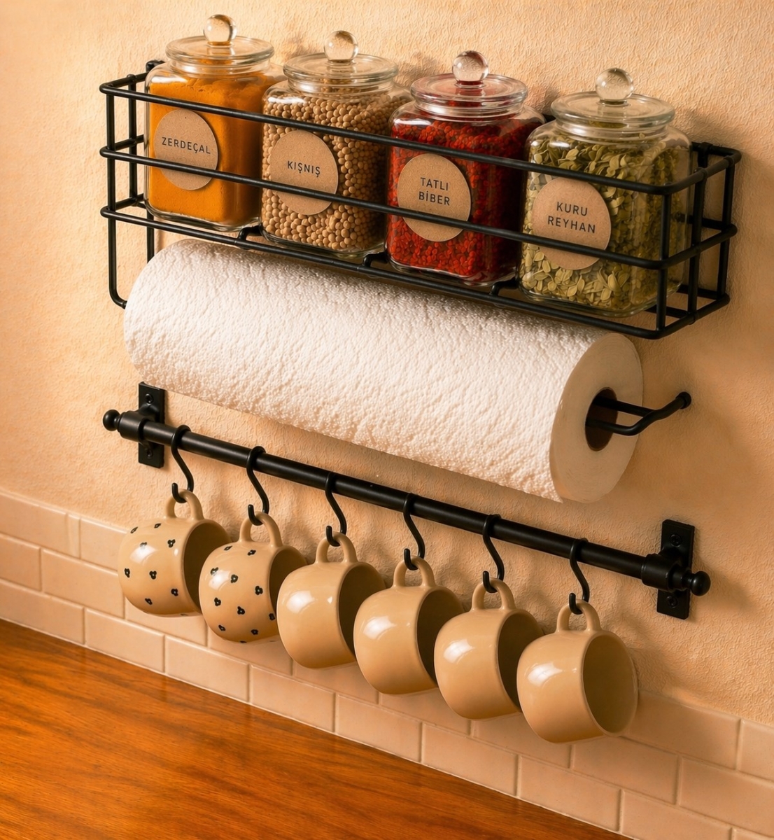 Çok Fonksiyonlu Tasarım: Üst kısım; geniş baharatlık rafı ve hemen altında yer alan rulo kağıt havluluk bölmesi ile alan tasarrufu sağlar. Alt kısım ise 6 adet sağlam kancasıyla kupalarınızı, fincanlarınızı veya mutfak gereçlerinizi düzenli tutar.