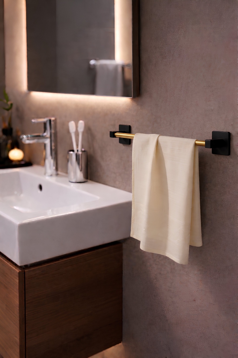 Yapışkanlı Gold Uzun Havluluk, banyonuza hem şıklık hem de pratiklik kazandırır. Delme gerektirmeyen yapısı sayesinde duvarlarınıza zarar vermeden kolayca monte edilir ve anında kullanıma hazır hale gelir. Modern altın renk tasarımı ile banyo dekorasyonunuza estetik bir dokunuş katar.