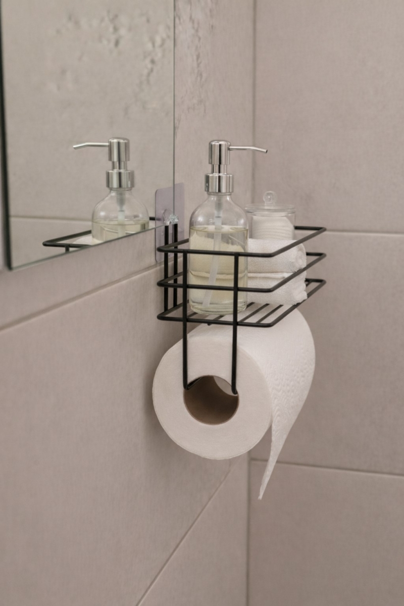 Banyonuzda ya da mutfağınızda ekstra yer açmak için tasarlanan Siyah yapışkanlı raflı kağıt rulo havluluk ve peçetelik, güçlü yapışkanı sayesinde delme veya vidalama gerektirmeden kolayca monte edilir. Modern ve pratik tasarımıyla dağınıklığı toplar, düzeni sağlar.