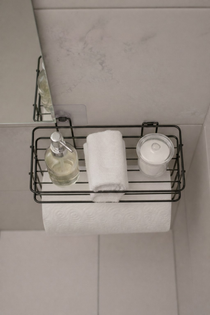 Raflı Tasarım: Kağıt havlu askısı altında ekstra raf ile yer tasarrufu sağlar.