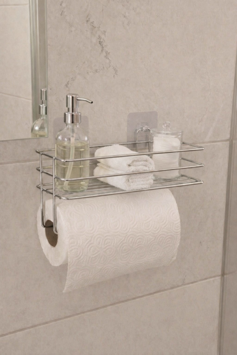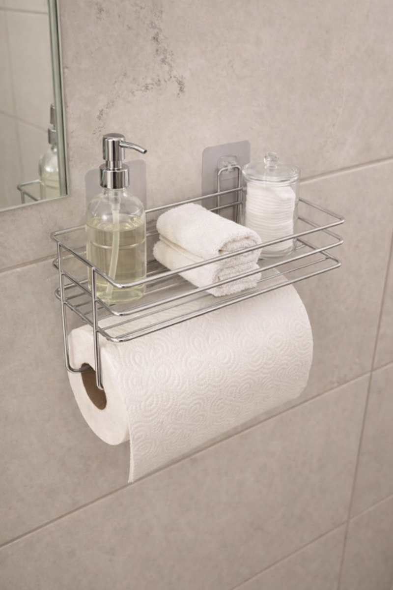 Raflı Tasarım: Kağıt havlu askısı altında ekstra raf ile yer tasarrufu sağlar.
