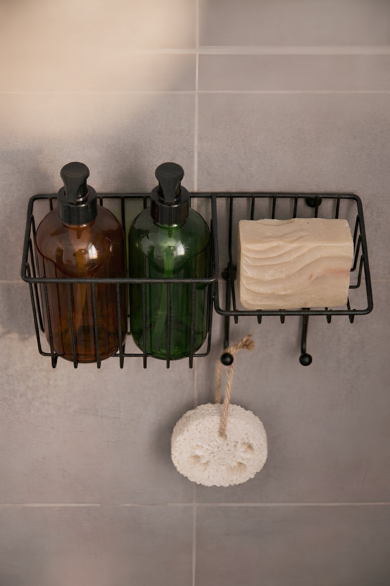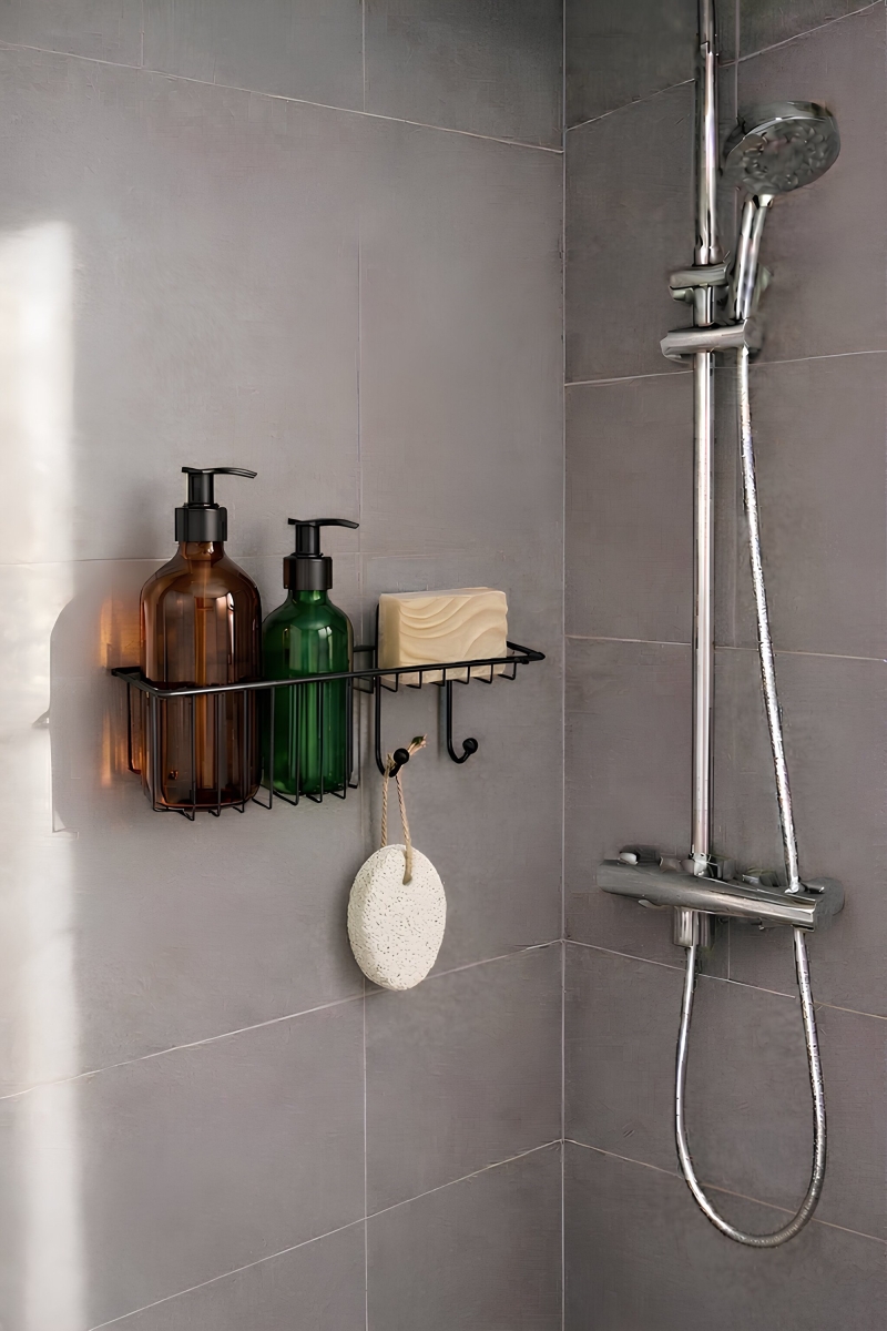 Banyonuzda şıklık ve düzeni bir arada sunan siyah şampuanlık duş rafı, kompakt ölçüleri ve dayanıklı yapısıyla şampuan, duş jeli ve banyo aksesuarlarınızı düzenlemenize yardımcı olur.